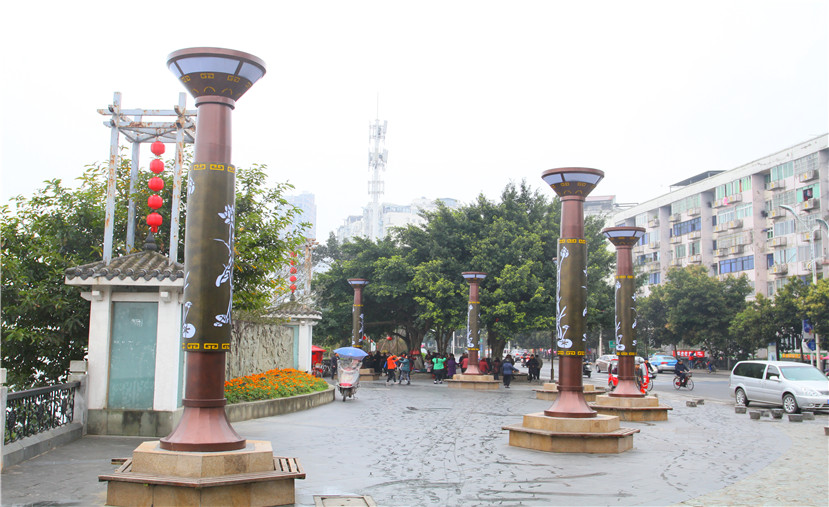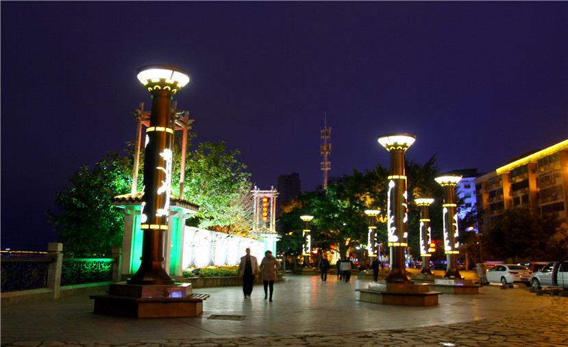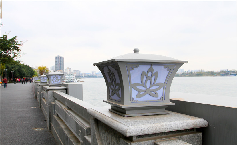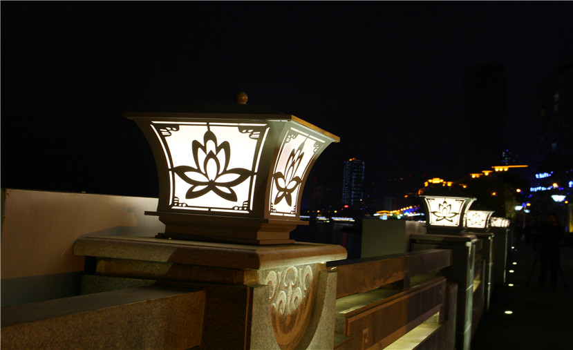 在重要的景觀廣場(chǎng)上,增加投影燈和廣場(chǎng)燈柱結(jié)合,并在設(shè)計(jì)中加入水紋蓮花古銅紋理和云石蓮花,在白天起到美化廣場(chǎng)的景觀效果,在夜景中又能展示不同的燈光效果,帶來(lái)富有特色的遂寧夜景。