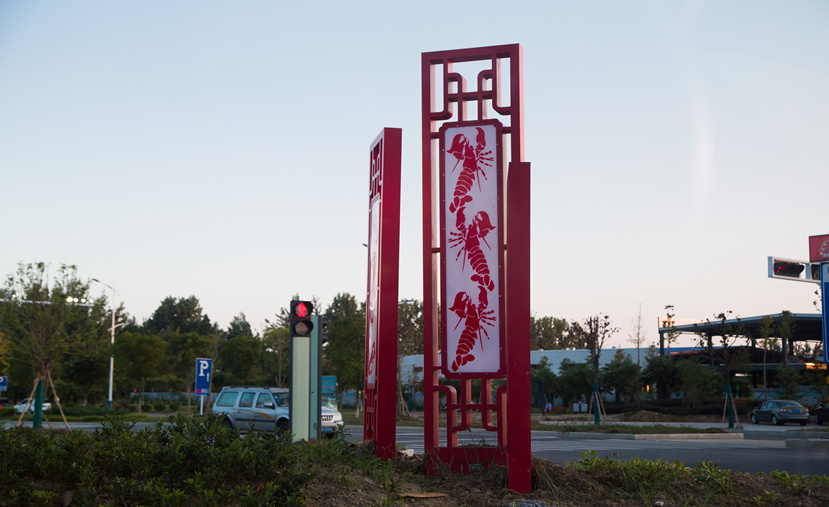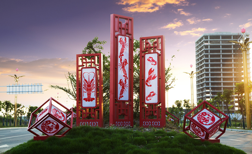 “群蝦迎客”屏風(fēng)景觀燈高3米,寬1.8米,中部設(shè)有LED裝飾性光源。整燈以屏風(fēng)為載體,采用小龍蝦的各種形態(tài)為表現(xiàn)手法,整體造型簡潔素雅展現(xiàn)出小龍蝦的活力。