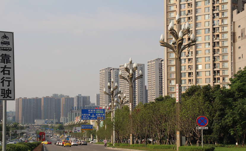玉蘭燈,高15.08米,既有主光源,又有裝飾光源,皆采用LED,彰顯節(jié)能環(huán)保理念,既滿足了二郎迎賓大道和科成路路段的照明需求,同時(shí)也能起到裝飾美化城區(qū)面貌的作用。