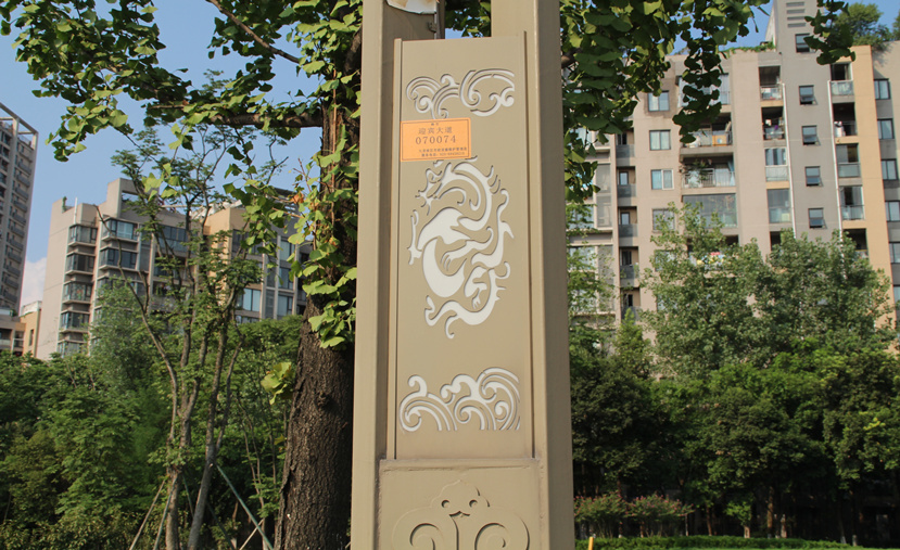 建立于春秋戰(zhàn)國(guó)時(shí)期的巴國(guó)以重慶為中心,創(chuàng)造了自己的文化,即巴文化,并且這種文化一直延續(xù)至今,成為連接古今巴文化的重要紐帶。設(shè)計(jì)者提取巴文化元素,在玉蘭燈底座采用巴文化花紋做浮雕。燈桿中部安裝兩個(gè)燈箱,上面的紋飾采用高新區(qū)和工業(yè)城的LOGO,并雕刻“高新九龍坡”和“百年工業(yè)城”的字樣紋飾。燈桿下部分雕刻龍紋紋飾,與地方方位名稱相得益彰,象征九龍坡。