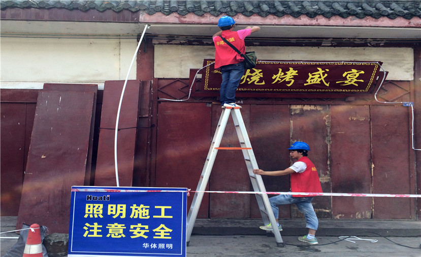 此次安裝工程時(shí)間緊、任務(wù)重,特別是天氣炎熱的夏天,是黃龍溪古鎮(zhèn)的旅游旺季,人流量特別大,為了不影響景區(qū)正常運(yùn)營(yíng),華體照明安裝隊(duì)伍選擇早上六點(diǎn)到十點(diǎn)和下午六點(diǎn)到晚上十點(diǎn)兩個(gè)時(shí)間段錯(cuò)峰施工。