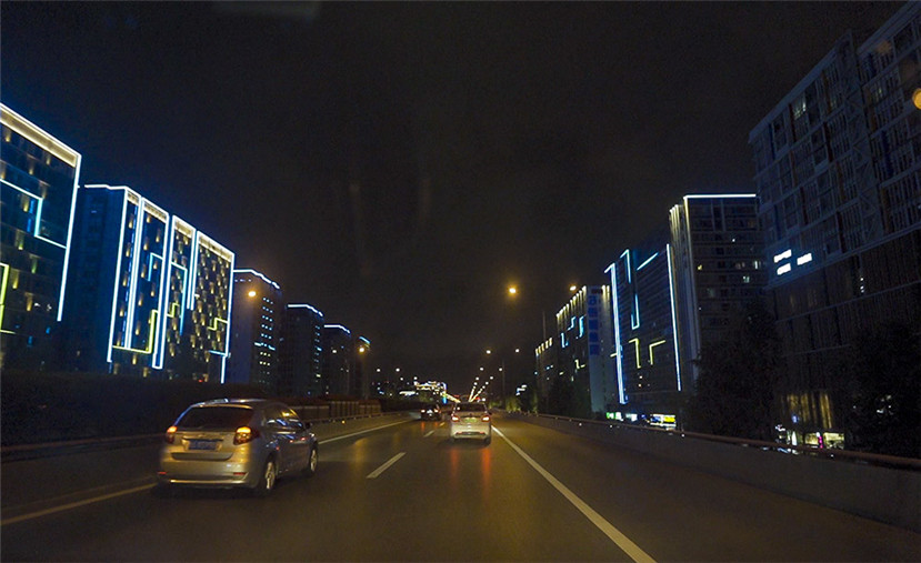 目光來到機場高速沿線,當乘車飛馳在機場高速上時,旅客可以欣賞到兩邊的建筑樓宇夜景。投光燈在展現(xiàn)建筑夜間結構美的同時,樓宇上的動感氛圍燈通過變化慢慢向前延伸和追逐,光影的流動體現(xiàn)的是成都的律動。