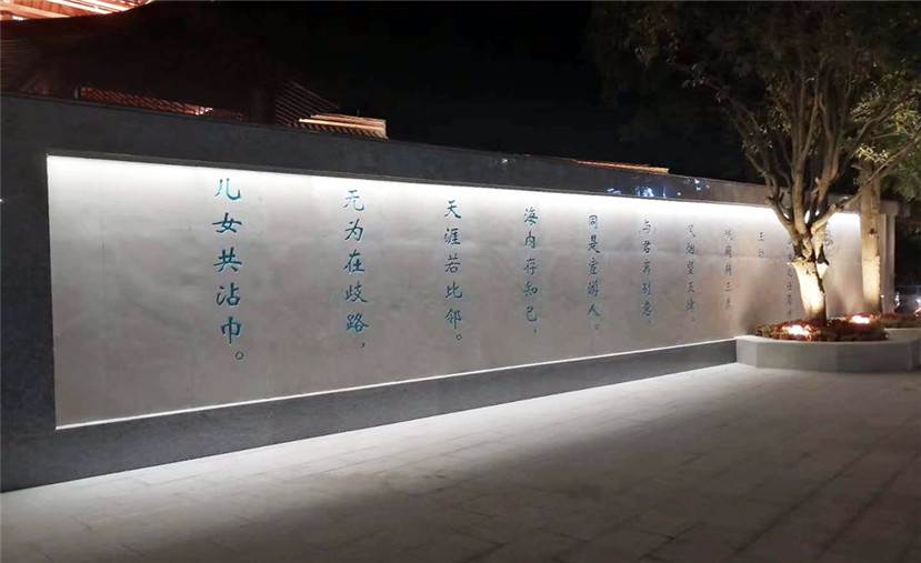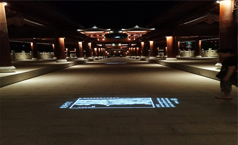 在景觀亭頂部照明及風(fēng)雨廊頂部照明的光環(huán)境下,華體結(jié)合地面原有文化浮雕,采用燈光投影的方式,將新津十二景的一筆一劃投射到地面,通過一橋,看遍新津十二景。
